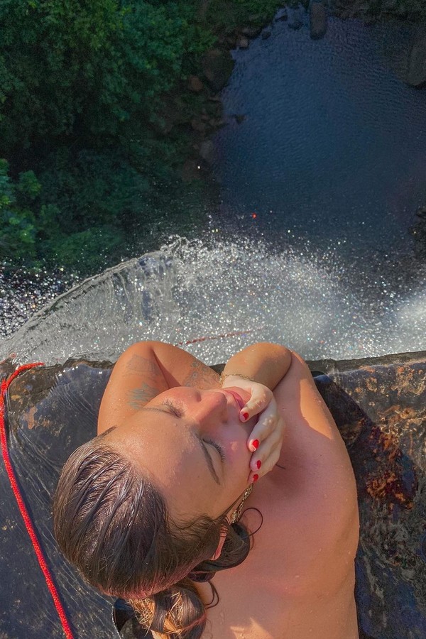 Nas imagens, ela aparece no topo de uma cachoeira em Serras Gerais, no Tocantins, e até aproveita para fazer topless enquanto aproveita o tempo em meio a natureza.