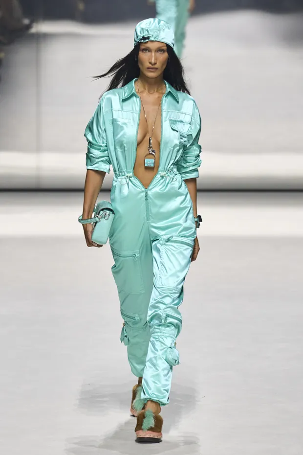 Modelo marcou presença na apresentação da Fendi usando um look recém-desfilado por Bella Hadid