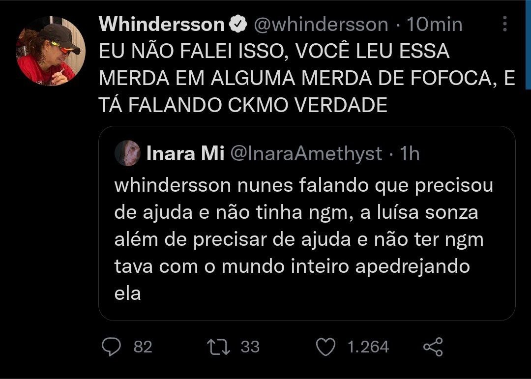 O humorista ainda corrigiu outro comentário que dizia "Whindersson Nunes falando que precisou de ajuda e não tinha ninguém, a Luísa Sonza além de precisar de ajuda e não ter ninguém tava com o mundo inteiro apedrejando ela". Ele respondeu: "EU NÃO FALEI ISSO, VOCÊ LEU ESSA MERDA EM ALGUMA MERDA DE FOFOCA, E TÁ FALANDO COMO VERDADE."