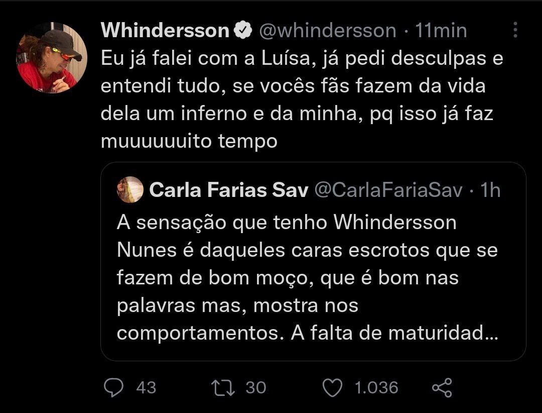 Ele continuou, rebatendo outro internauta que falou sobre "falta de maturidade em não deixar a Luísa em paz. "Eu já falei com a Luísa, já pedi desculpas e entendi tudo, só vocês fãs fazem da vida dela um inferno e da minha, porque isso já faz muuuuuuito tempo", escreveu.