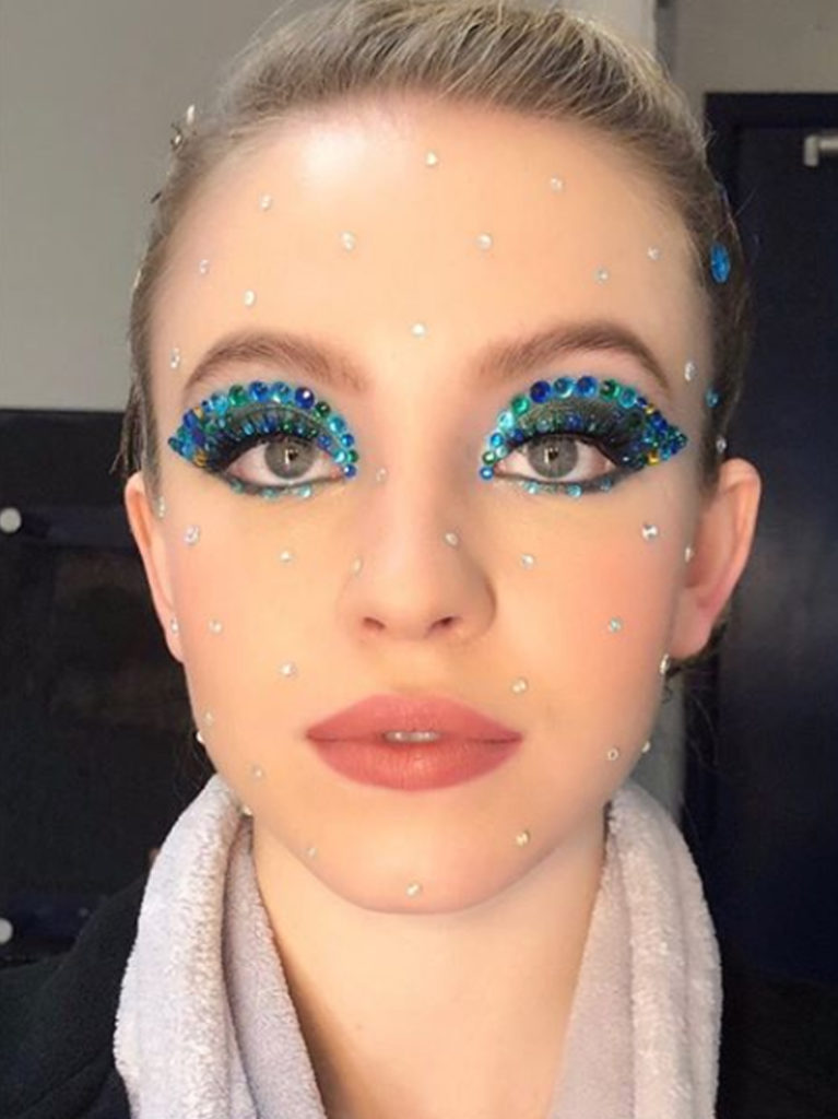 Para fazer a maquiagem é simples: prepare a pele normalmente e faça um olho esfumado preto ou marrom escuro. Por cima dele aplique o glitter em toda a pálpebra móvel. Finalize a make colocando cílios postiços grandes, volumosos e, se quiser, coloridos.