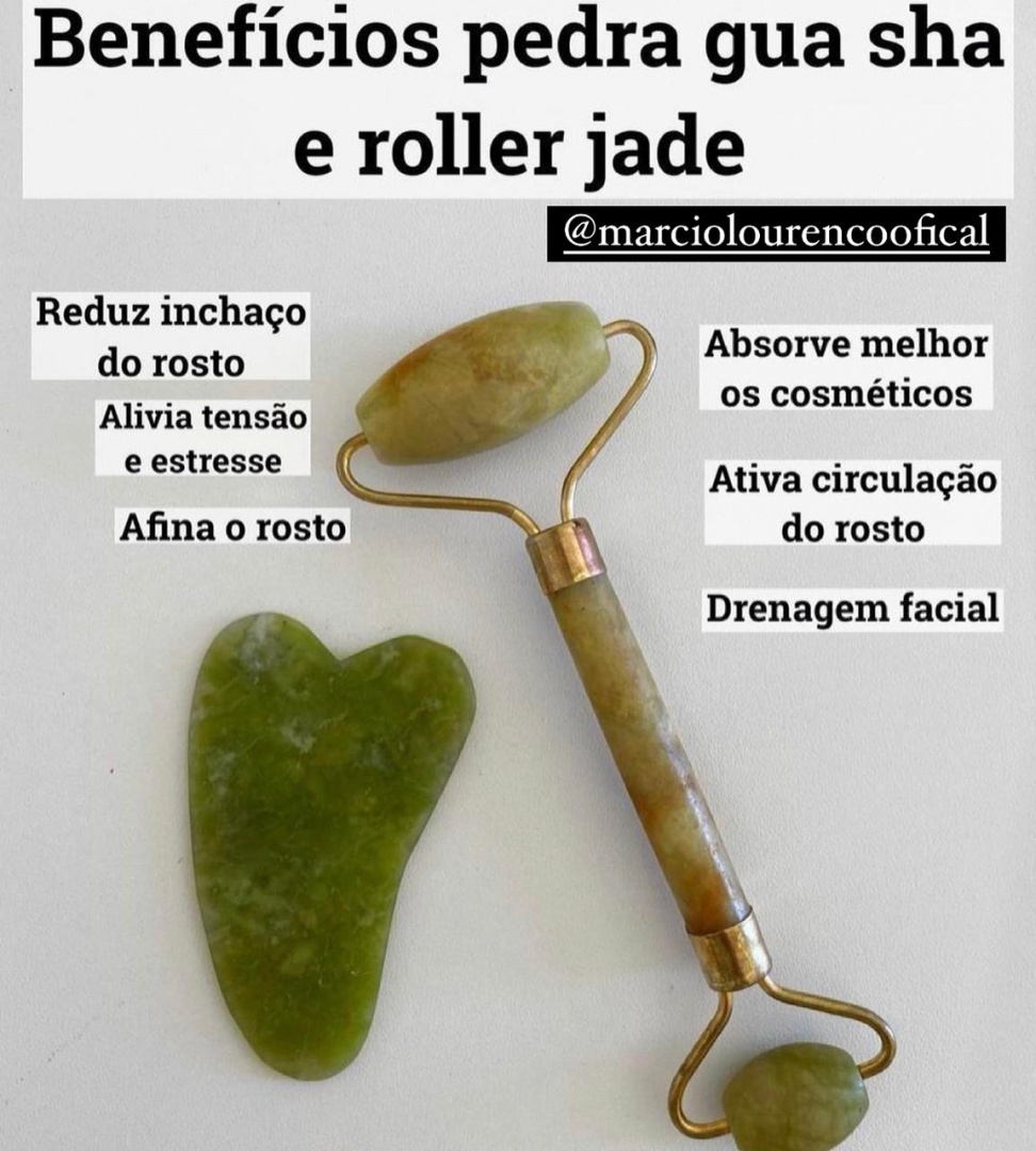 Os rollers de jade e quartzo-rosa são como um rolo de pintura, mas no lugar da espuma, levam duas pedras preciosas inteiriças em cada extremidade. Com tamanhos distintos, existe uma pedra maior para bochechas, mandíbulas e testa, e uma pedra menor para a área dos olhos, nariz e ao redor da boca. Já o Gua Sha, ferramenta conhecida como Botox Oriental, pode ser usada no corpo todo para soltar a musculatura da face, como rosto e pescoço, e promete lifting instantâneo, melhorando os contornos faciais após a automassagem. Com formato anatômico, permite o encaixe perfeito no queixo, bochechas e nariz, por exemplo.