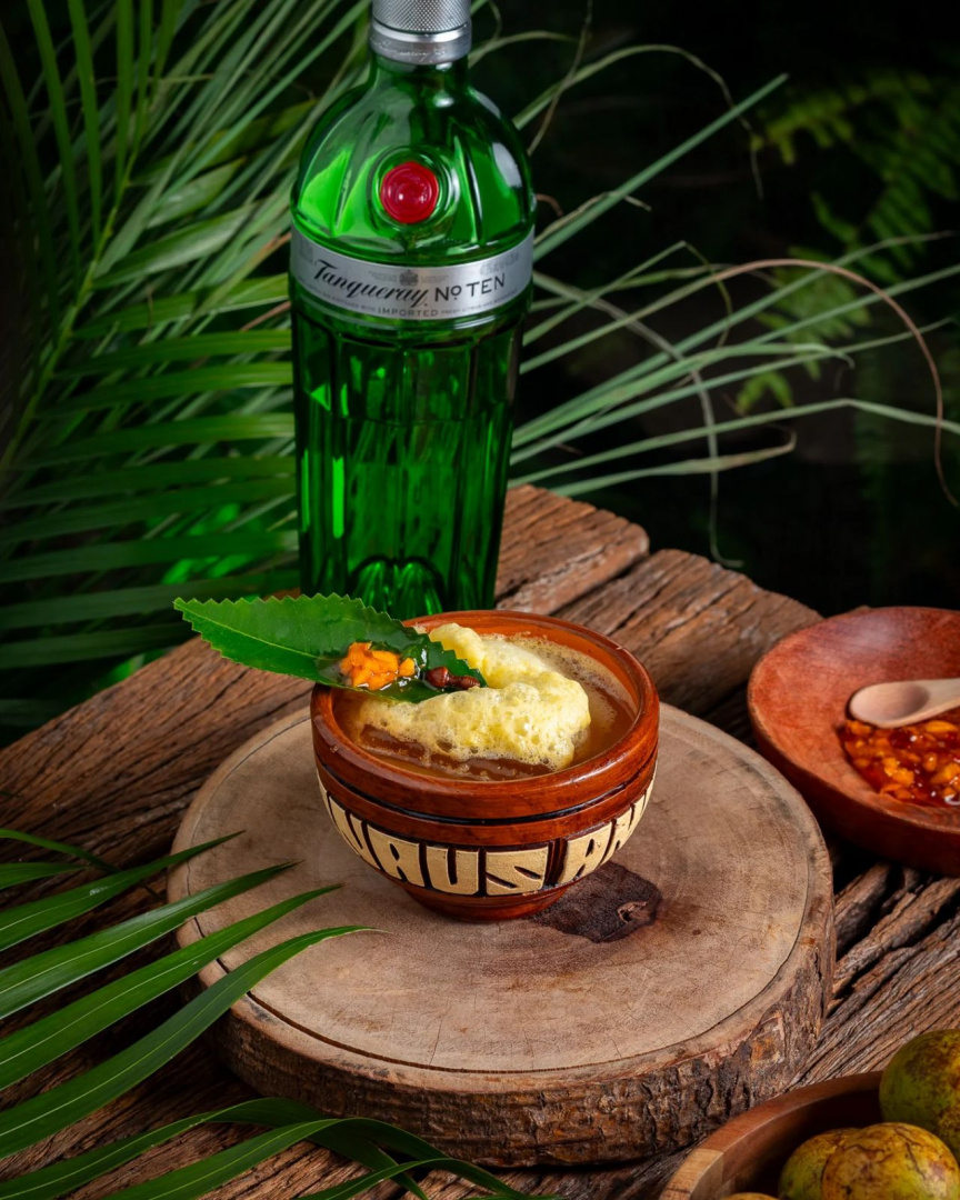 Neste coquetel, busquei criar um equilíbrio perfeito entre as notas herbais, cítricas e frutadas. A espuma traz uma textura aveludada e suave, enquanto o toque final de geleia de tucumã com pimenta murupi e formiga maniwara deixa uma explosão de sabores agridoce e picante.