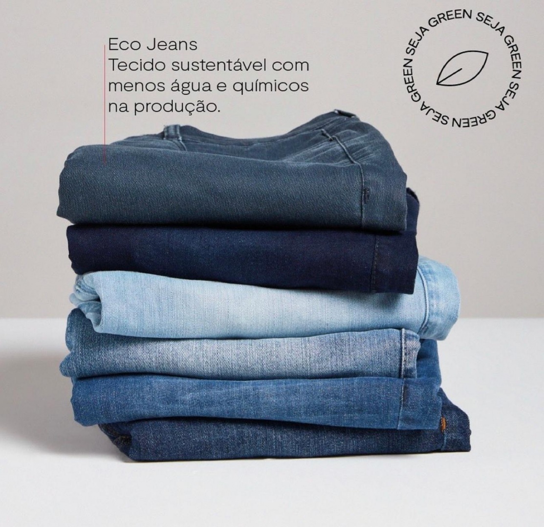 Nessa coleção, boa parte dos nossos jeans foram desenvolvidos com tecidos reutilizados ou à partir da reciclagem de garrafas PET. Além disso, utilizamos menos químicos e água na produção, para reduzir o consumo de recursos naturais, os descartes desnecessários e a emissão de poluentes no planeta.
