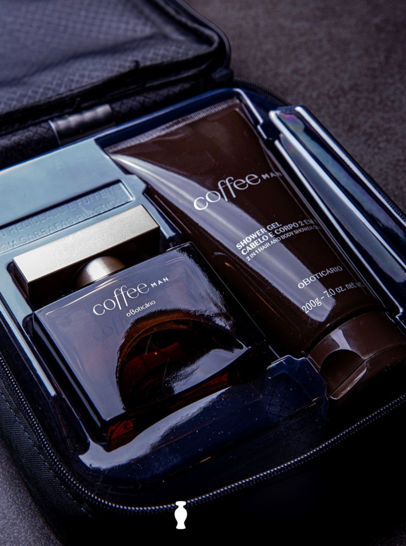 #PraTodosVerem: Imagem estática mostra um kit de presente da linha Coffee Man, com desodorante colônia e shower gel. Os dois produtos estão dentro de um estojo presenteável do Boticário.