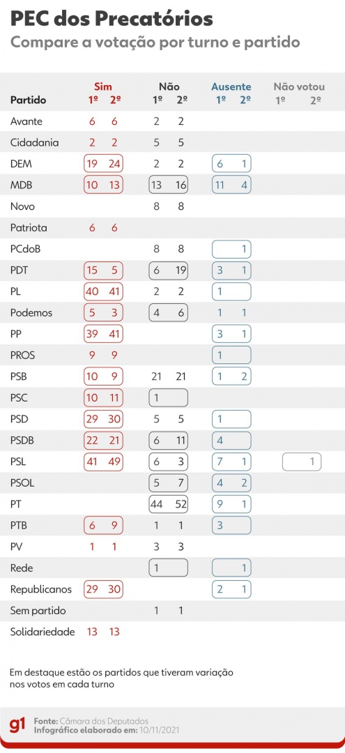 PEC dos Precatórios: compare a votação por turno e partido — Foto: arte g1