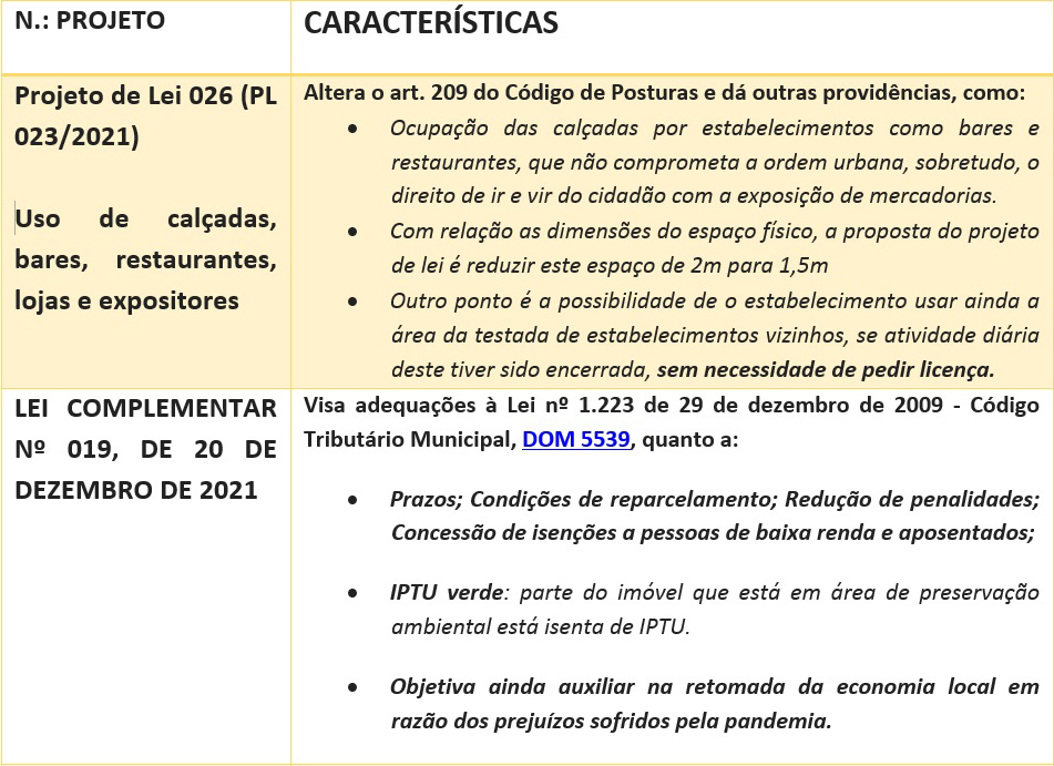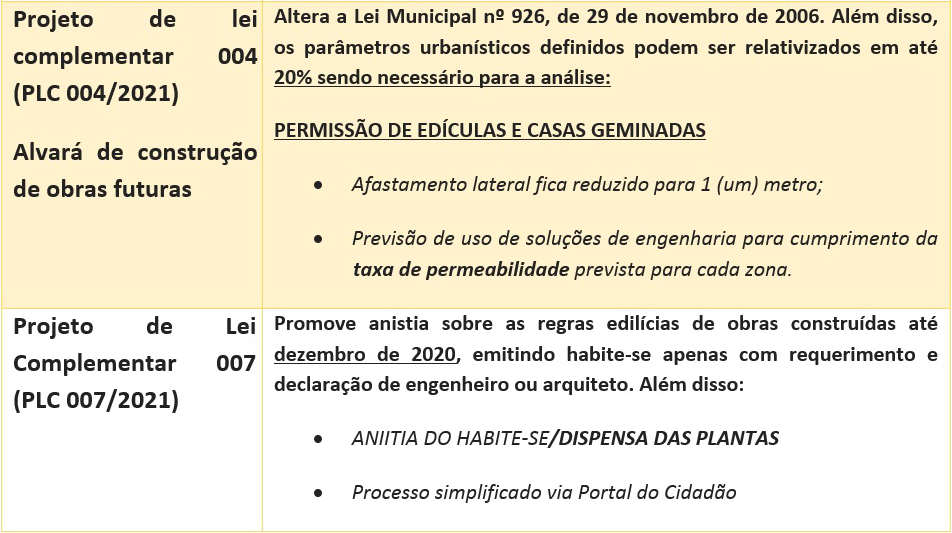 Os projetos envolvem medidas como alteração de itens do Código Tributário Municipal, lei de uso e ocupação do solo, uso de calçadas, além de isentar o pagamento do Imposto de Transferência de Bens e Imóveis (ITBI) para família de baixa renda. De acordo com o prefeito, todas as propostas vão flexibilizar as regras para regularização dos imóveis.