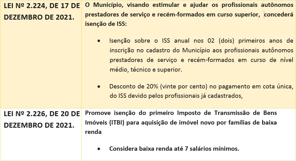 Outro benefício é a isenção do Imposto Sobre Serviços (ISS) para profissionais autônomos, recém-formado nos dois primeiros anos de cadastro. São beneficiados os prestadores de serviço e recém-formados em curso de nível médio, técnico e superior.