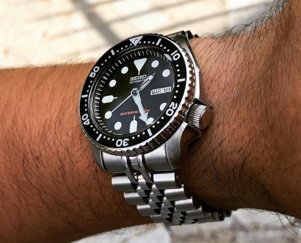 Seiko SKX007 sem nenhuma modificação, mas basta trocar a pulseira por uma de couro para que ele fique como o relógio da foto que abre este post.